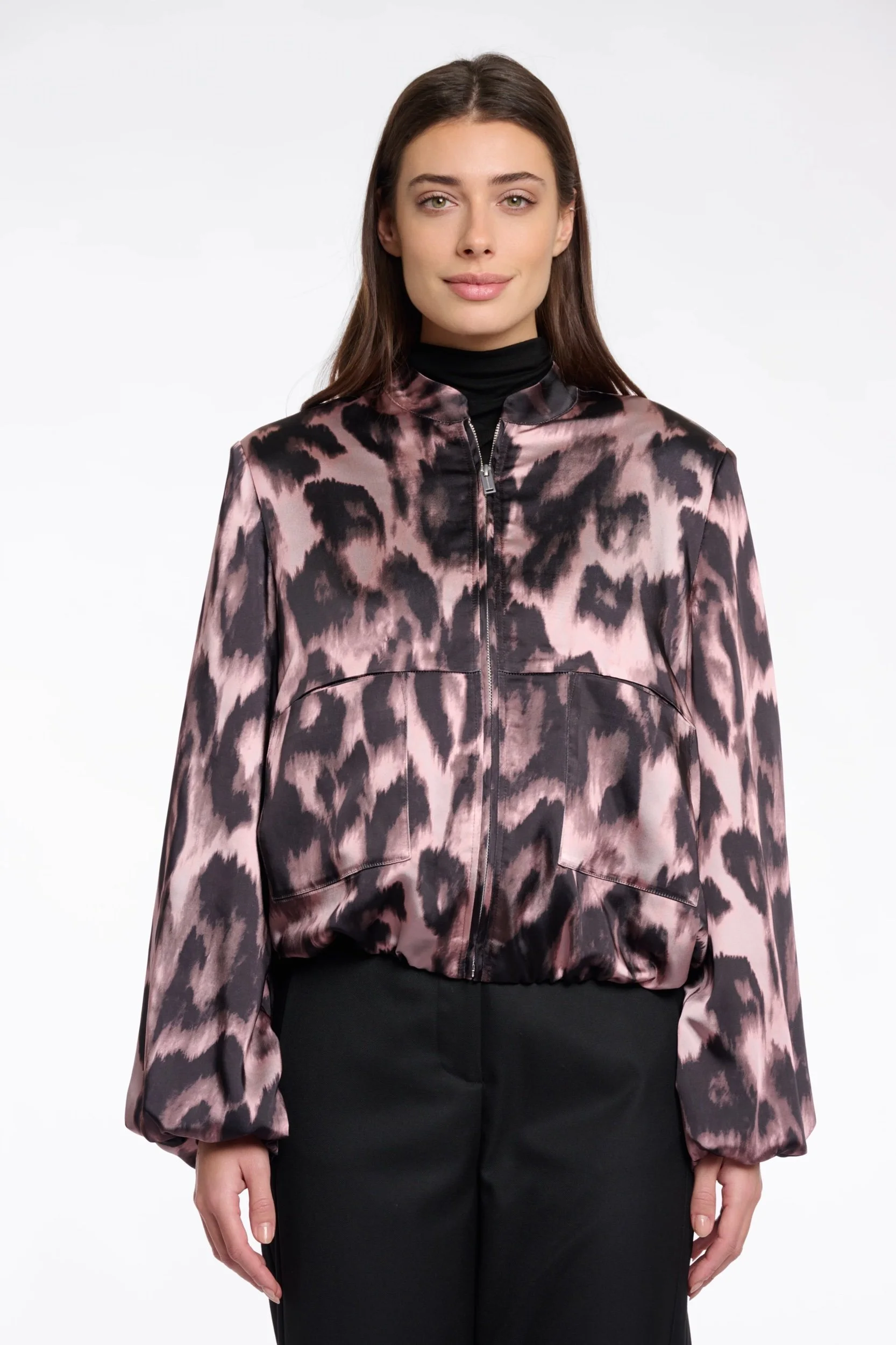 Embrace bold style with the Rino & Pelle Leopard Jacket Rachel. Featuring a pale pink and black blurry leopard print, this bomber jacket blends edgy design with softness. The zip-through front adds effortless convenience, while the 97% polyester and 3% elastane fabric ensures a comfortable, flexible fit that moves with you. Perfect for adding a fierce yet feminine touch to any outfit, this jacket is a standout piece for your wardrobe.