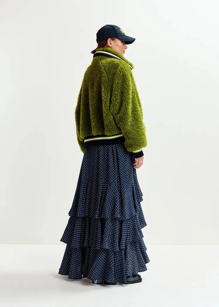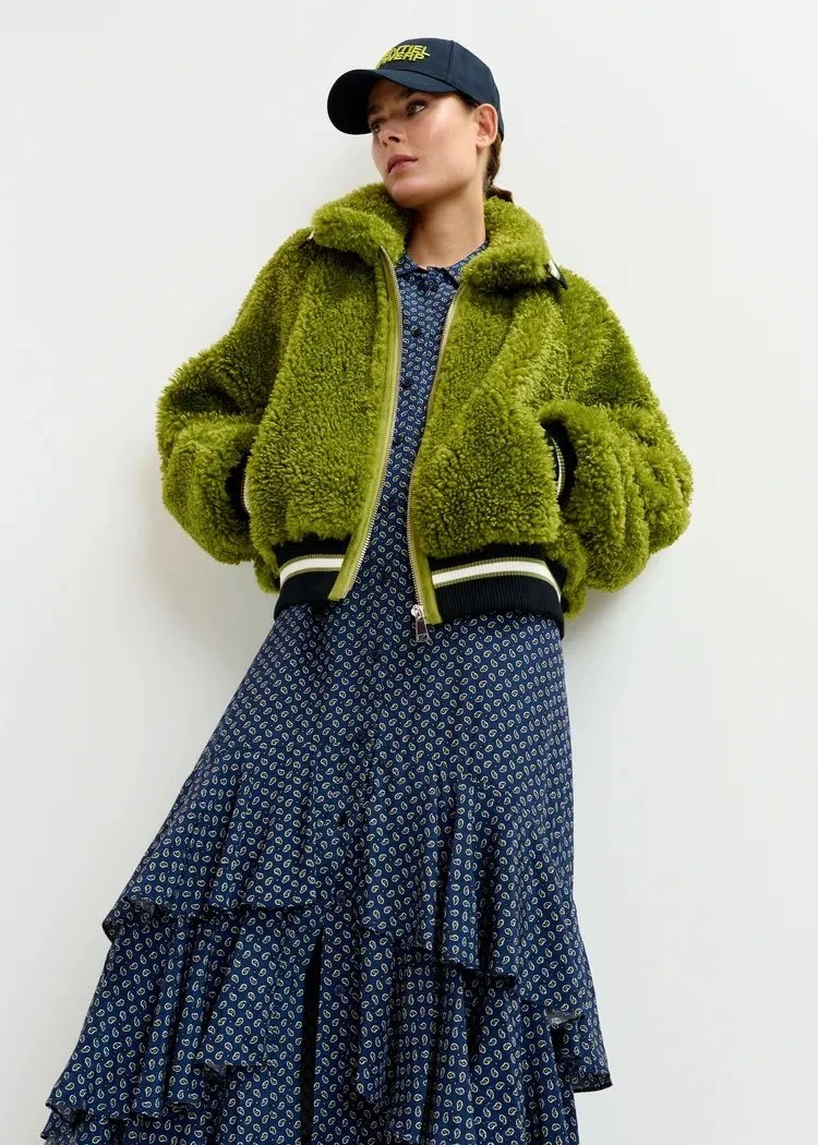 Bomber-style jacket is crafted with a high-pile faux shearling texture. Designed for an oversized fit, it features a full zip fastening and is fully lined for easy layering. Ribbed knit trims at the hem, cuffs, and collar add a sporty edge, while contrasting stripe details provide a graphic finish. Functional side pockets complete the look, making this jacket both stylish and practical for cooler days.