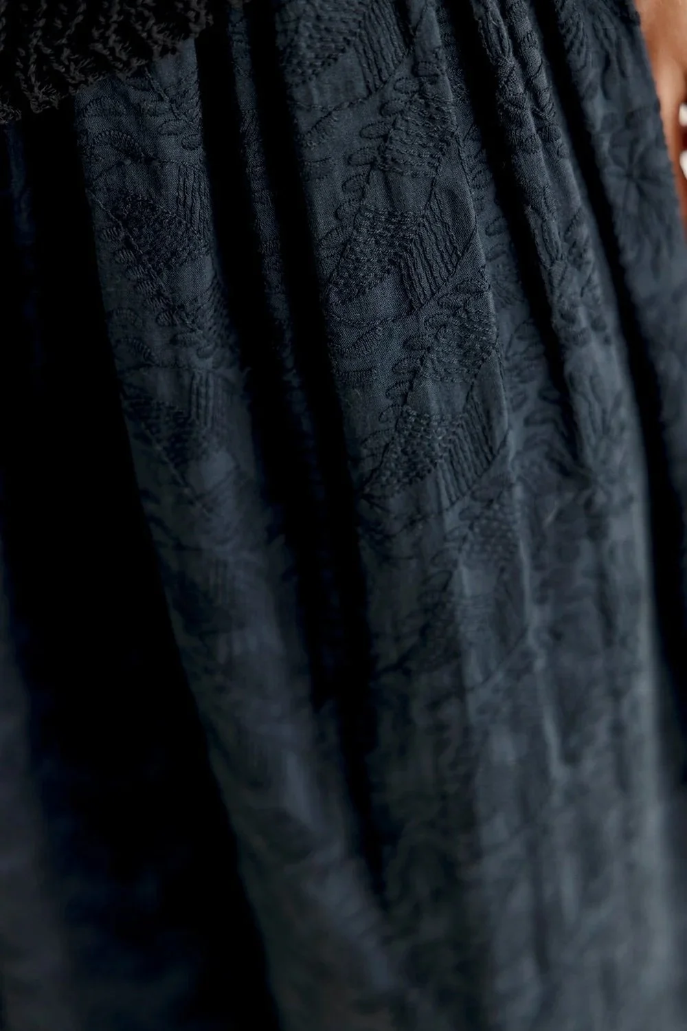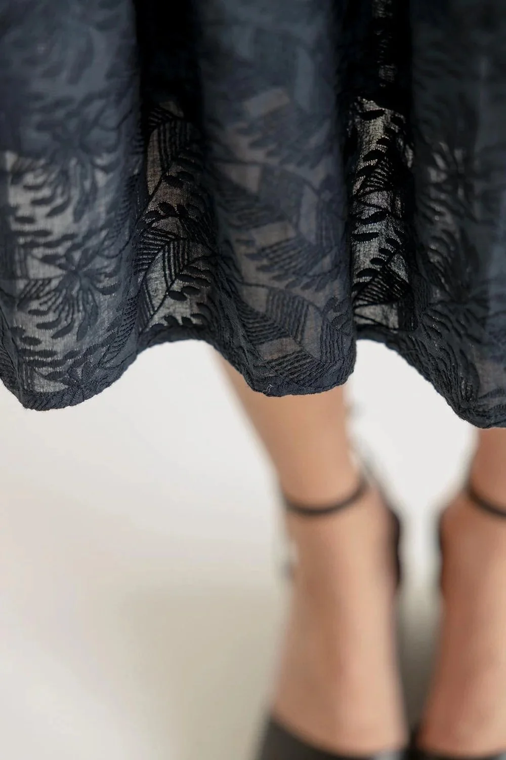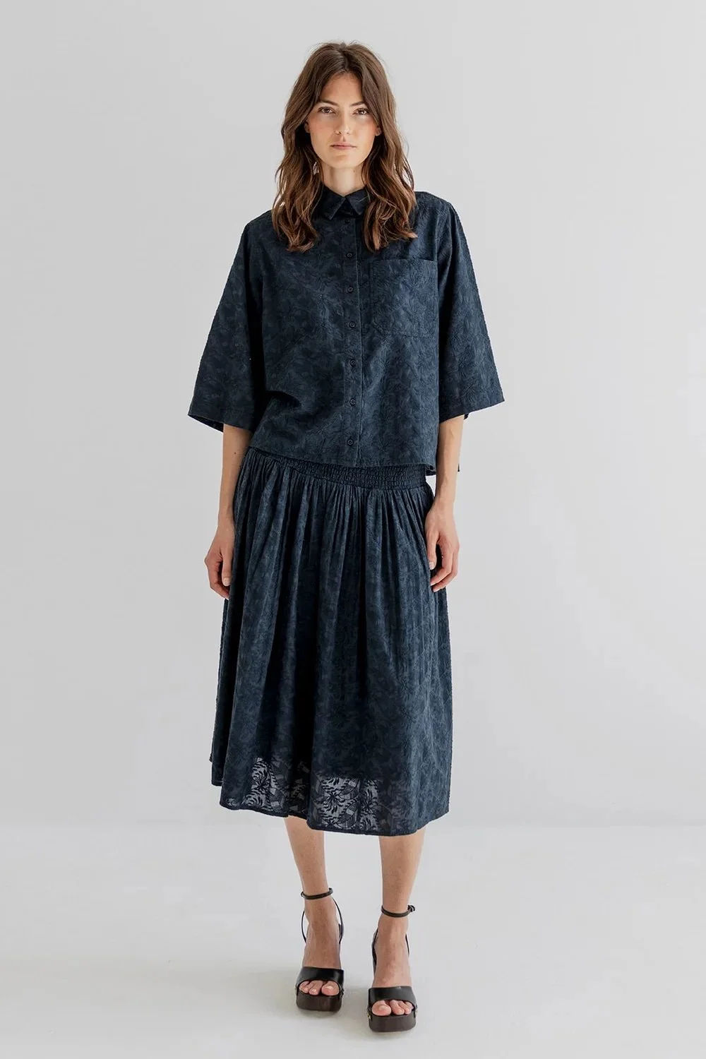 Hazel is a skirt in embroidered organic cotton with soft volume and natural movement. Designed with a smocked elastic waistband that sits comfortably at the waist and creates gentle gathers through the skirt. The textured embroidery gives the fabric structure while keeping the look light and feminine. Pair with the matching Hebe or Hortense shirt for a complete look.