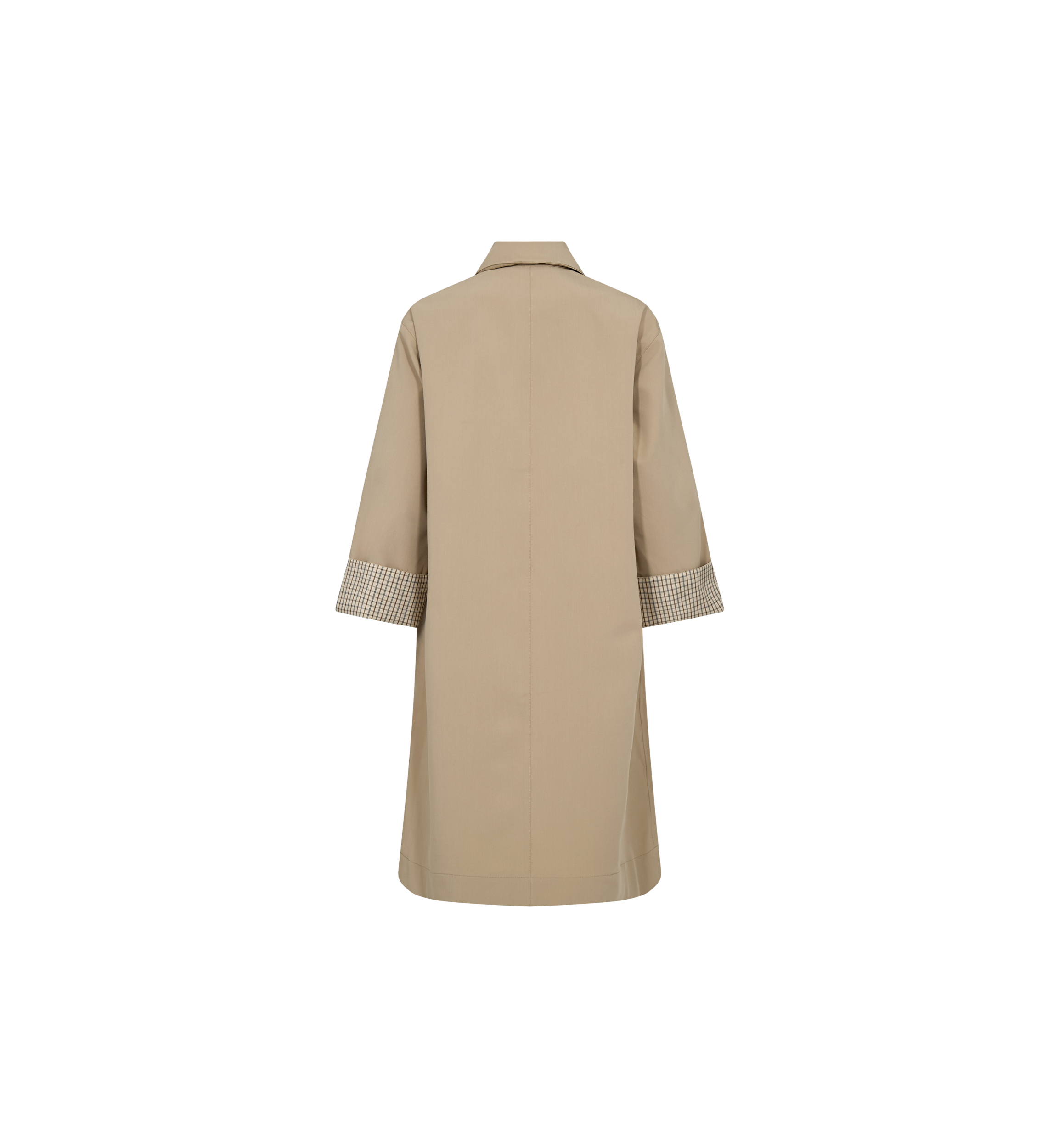 A modern twist on the timeless trench. This relaxed-fit coat features a classic collar, button closure, and cropped sleeves with contrasting striped cuffs for a refined touch. Crafted from a smooth, slightly stretchy blend, it offers effortless sophistication - perfect for layering over both tailored and casual looks.