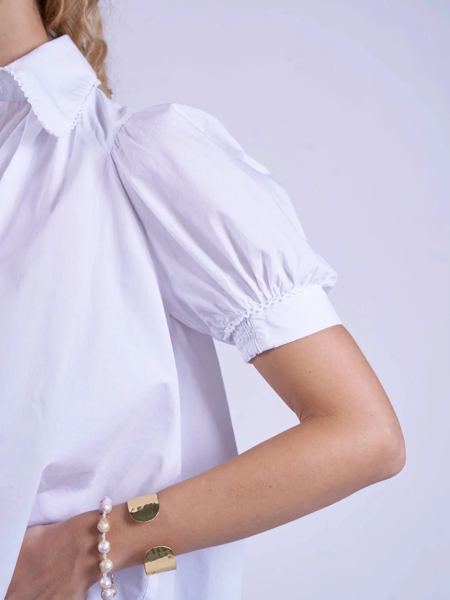 Crafted in crisp white cotton, the Paddington Blouse features the distinctive collar and sculptural shape that have become synonymous with the edgy details of our brand. With semi-elastic sleeve cuffs and our signature high–low hemline, it drapes beautifully for a flattering, modern silhouette. Designed to be worn tucked in or loose, it’s a standout piece with a surprise in every detail.