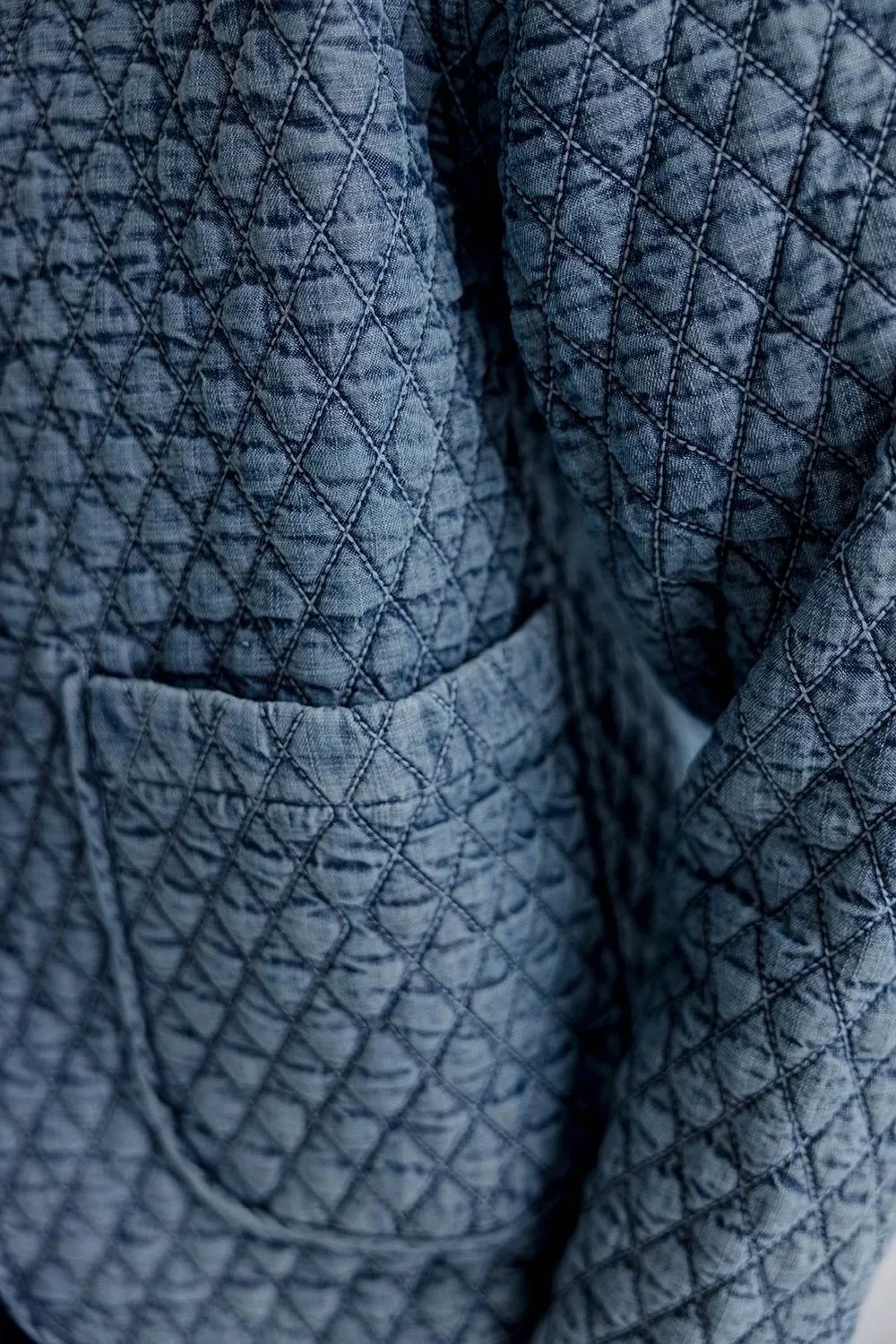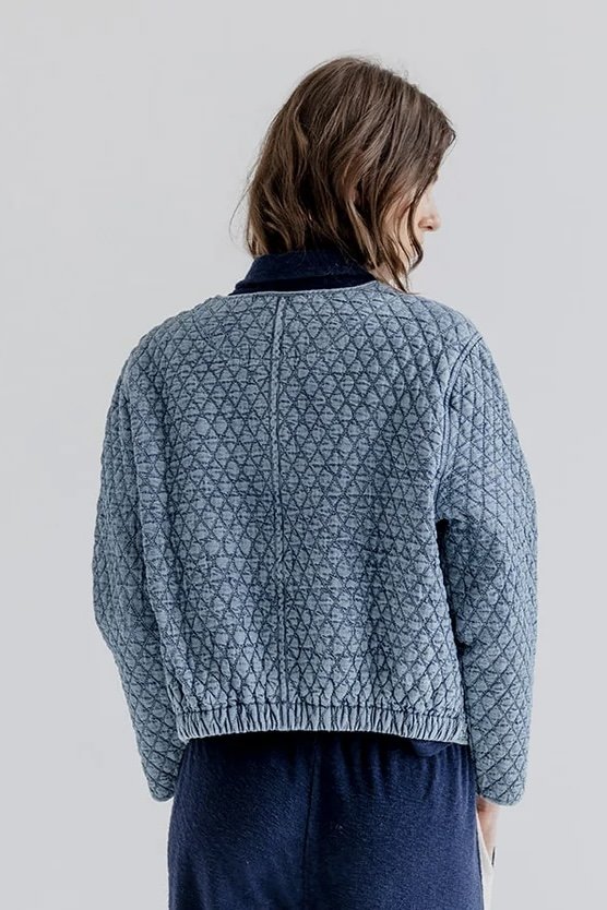 In color dark indigo, the jacket features matching dark blue stitching for a tonal look. In indigo, it is finished with contrasting white stitching that highlights the quilted pattern and seams.