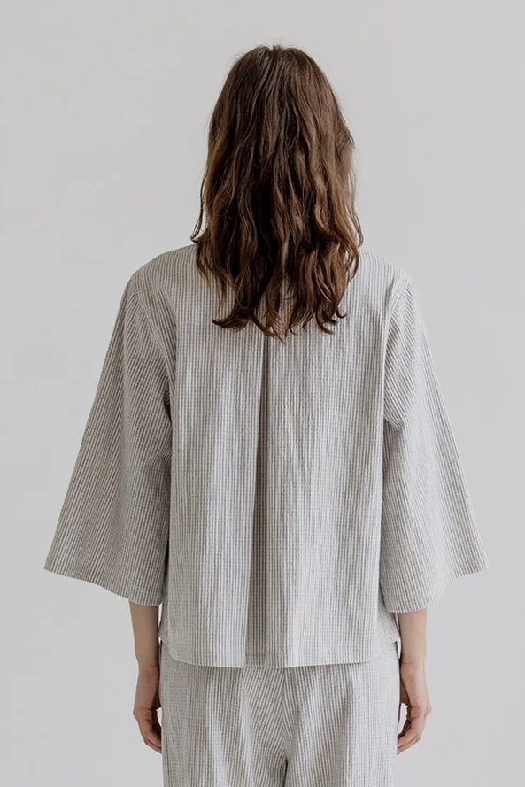 KIKKAN is a short quilted denim jacket with a relaxed silhouette and a round neckline. The jacket has long sleeves and two front patch pockets. A button closure with denim covered buttons runs down the front, keeping the look clean. The back hem is elastic to give more silhouette to the jacket. The quilted denim fabric adds texture and structure while remaining soft and comfortable to wear.