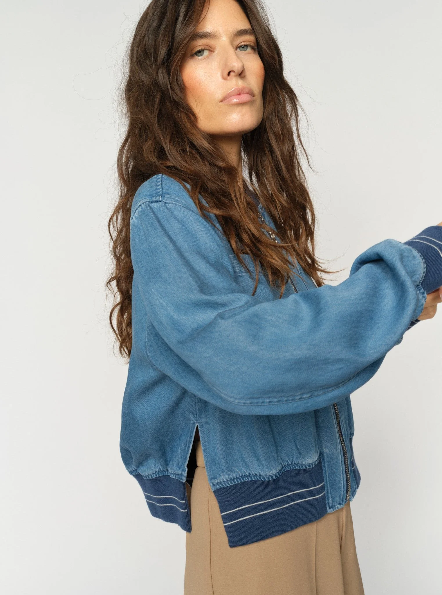 A cool take on the classic bomber silhouette. This jacket is designed in a relaxed fit with a zip closure, front pockets, and striped ribbed trims that add a sporty edge. Made from a soft, fluid fabric that drapes beautifully and feels lightweight to wear. Style it with jeans for a casual daytime look or layer it over a dress to create effortless contrast.