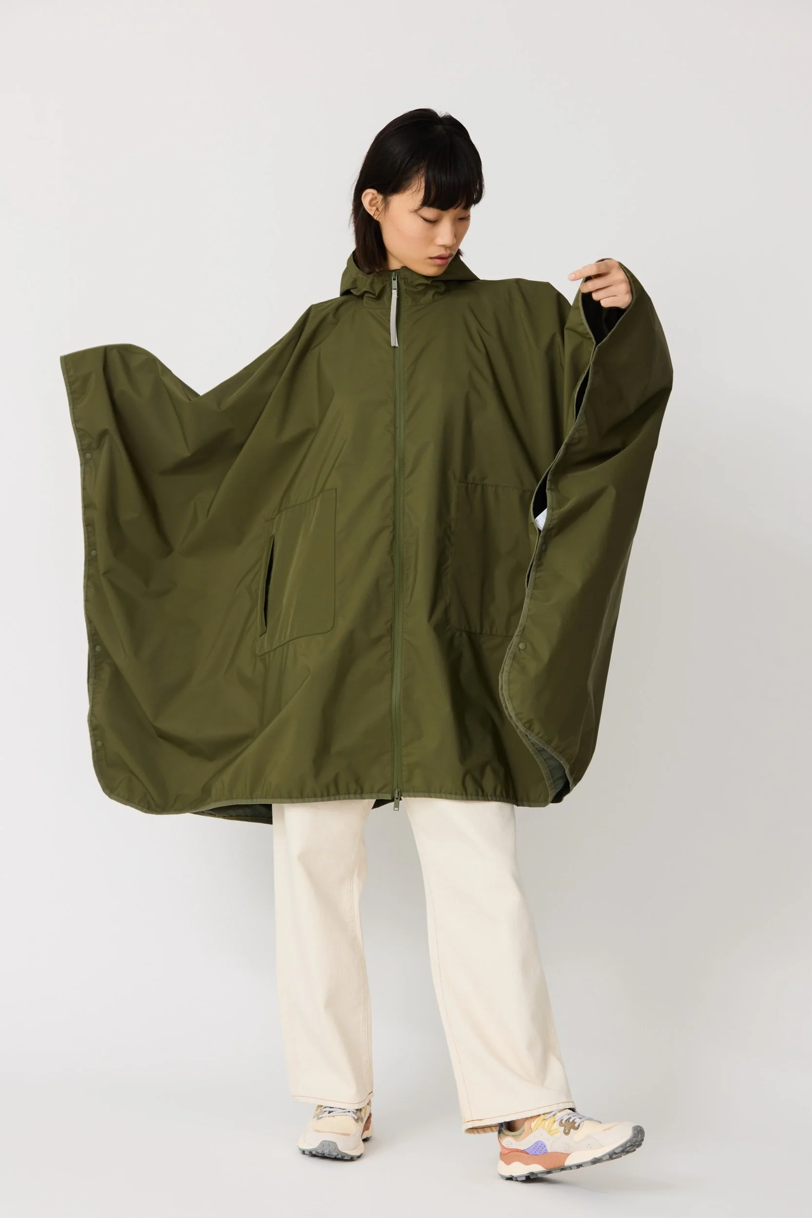 Vesi is a modern, oversized cape crafted from 100% recycled, breathable fabric. Designed as a single-piece garment, it layers effortlessly over any look. Bold in shape yet light in feel, it is a highly practical piece that can be packed away into its own pocket pouch, making it easy to carry wherever you go. A fresh, contemporary design that brings together sustainability, versatility and style.