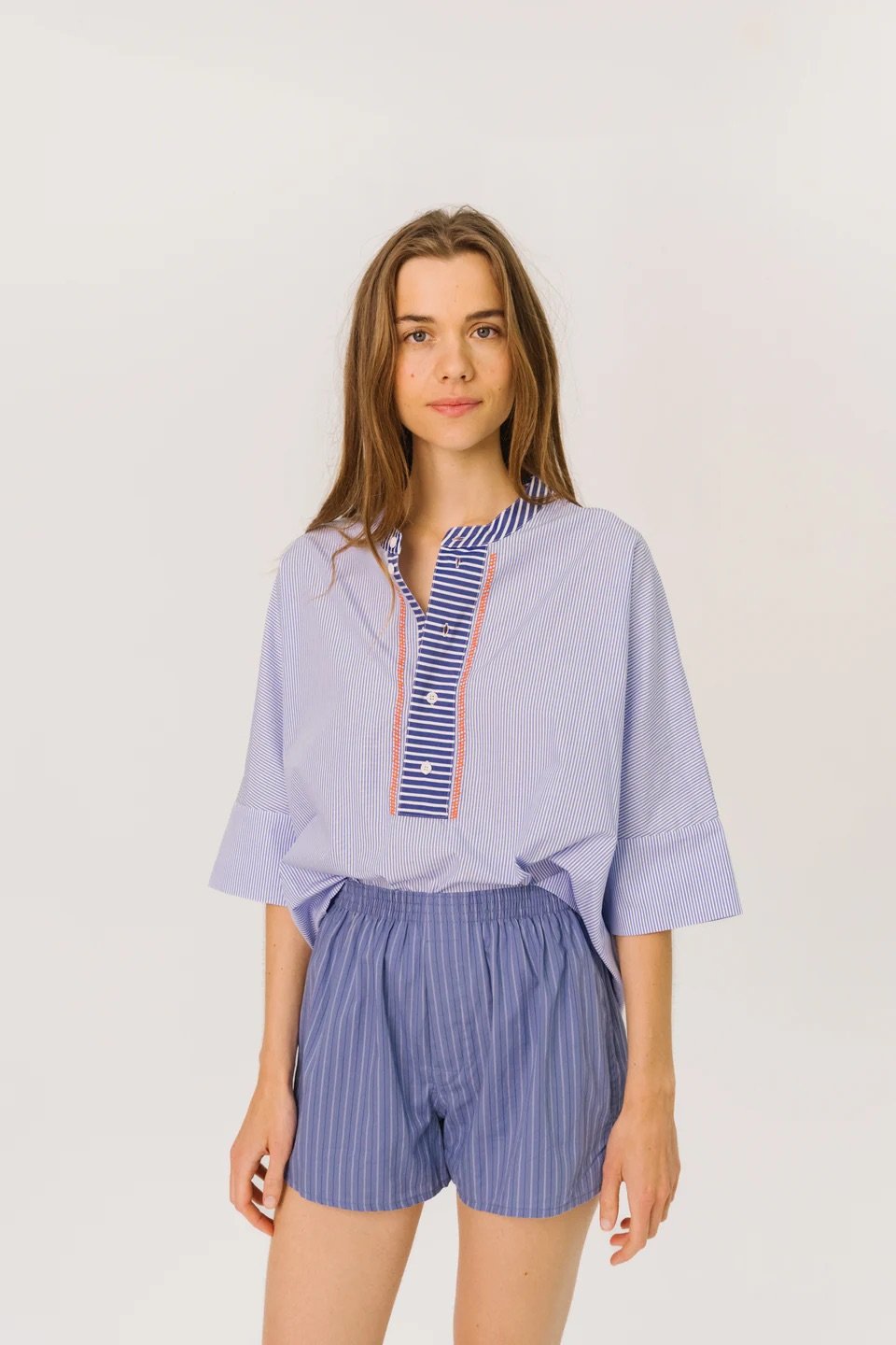 Short-sleeved top in cotton voile with a multicolored, painterly print. The loose, flowing cut is enhanced by gathers at the shoulders and back for a natural drape. Dropped shoulders, turn-up cuffs, a classic shirt collar, and exposed buttons create a look that is both comfortable and elegant.